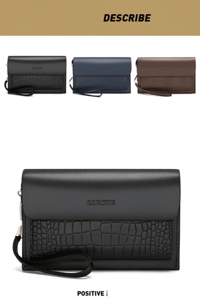 Excellent men’s clutch made from leather. So many of those advertised are not leather and do not last. This one is well made with lots of compartments. Perfect for travel to hold cards, phone, and other accessories.